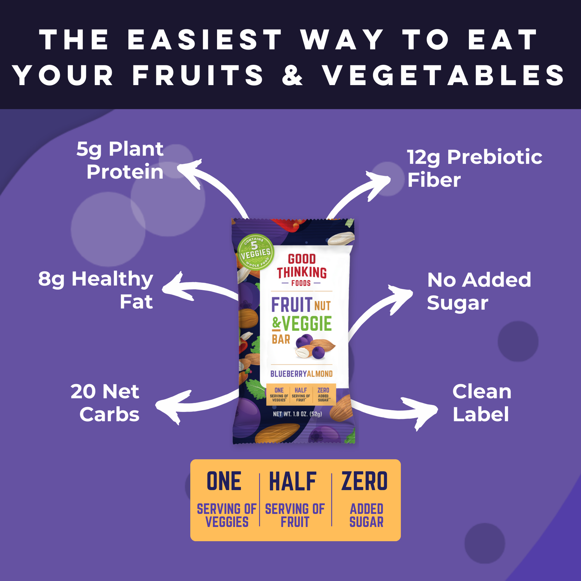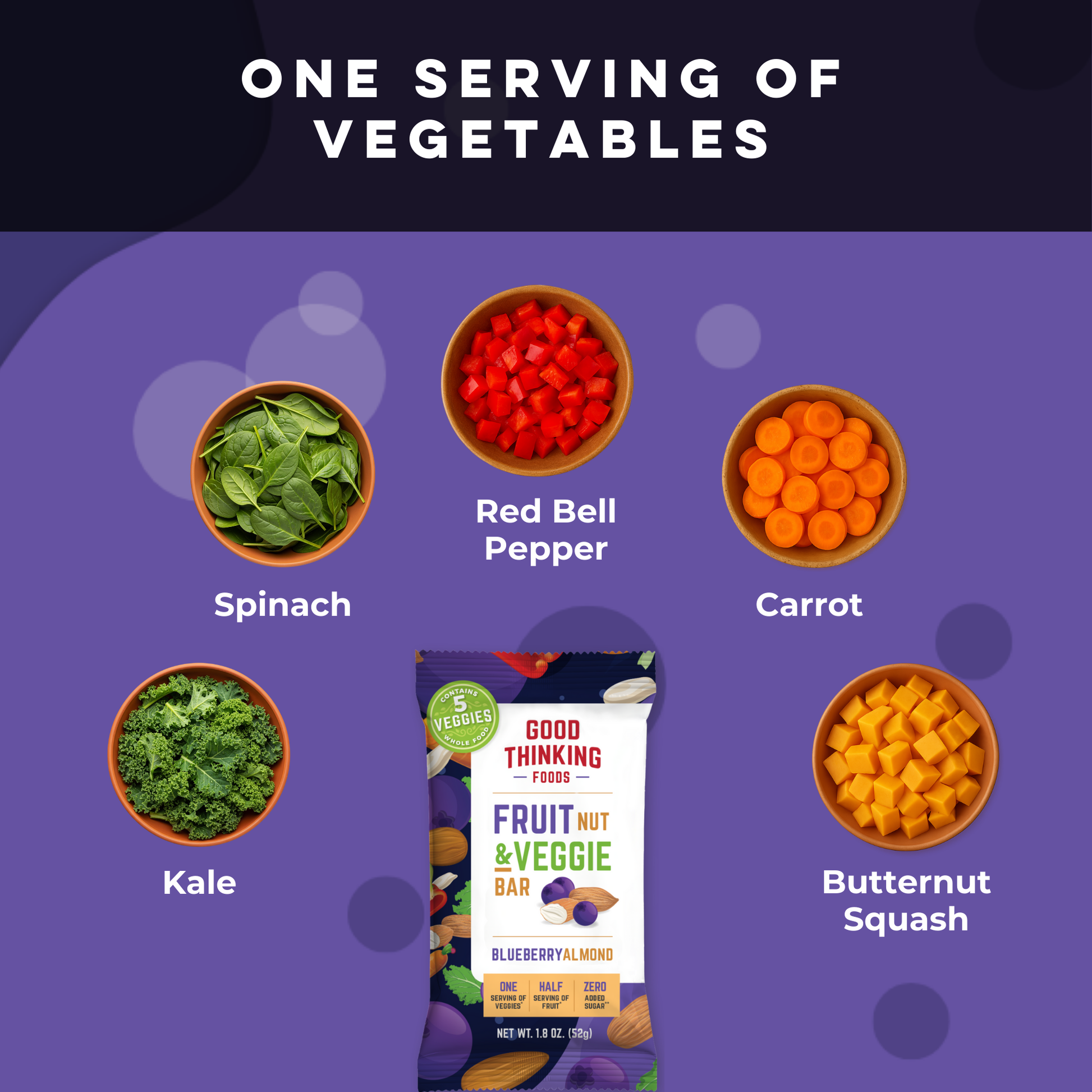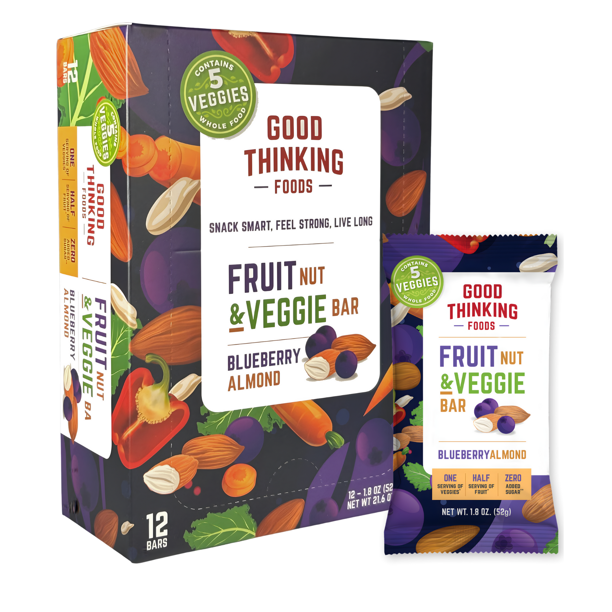 Made with 100% Real Fruits & Vegetables, No Added Sugar. No other bar on the market comes close to providing the brain and body boosting power of 1 cup of premium quality vegetables and a 1/4 to 1/2 cup premium quality real fruit with no added sugar. If you’re looking to eat a plant-based diet, it doesn’t get any more plant-based than a Good Thinking Bar.