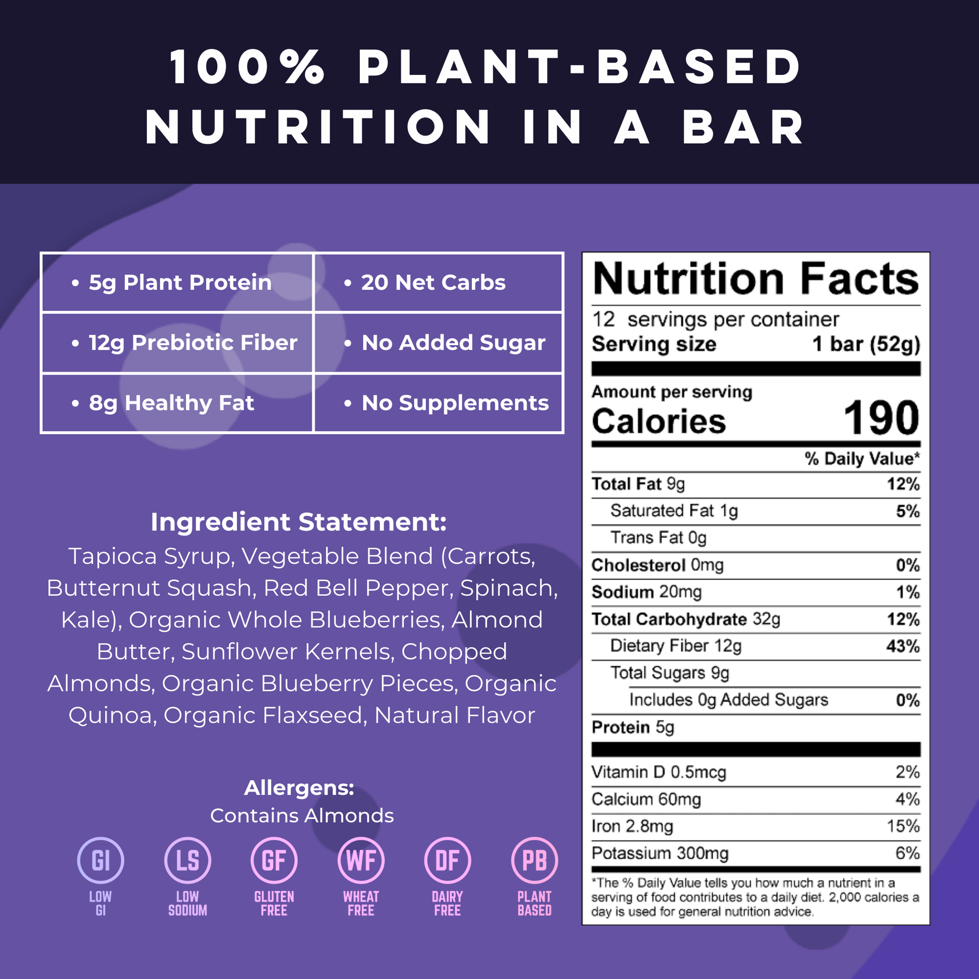 Ingredient Statement: Almonds, Organic Blueberries, Soluble Tapioca Fiber, Sunflower Kernels, Carrot, Butternut Squash, Organic Quinoa, Red Bell Pepper, Organic Flaxseed, Spinach, Kale, Natural Flavor, Cashews, Walnuts. Allergens: Contains Almonds, Cashews, Walnuts.