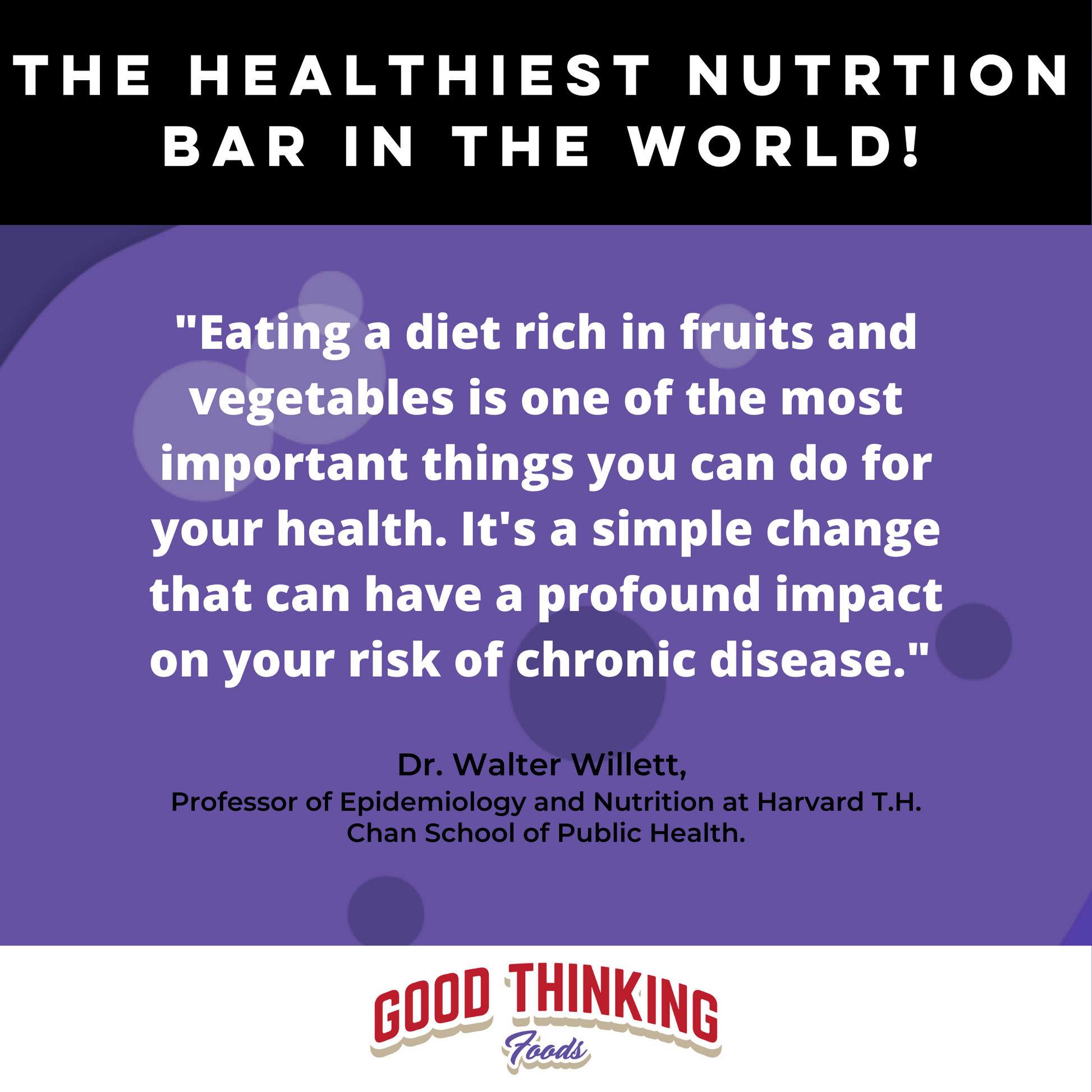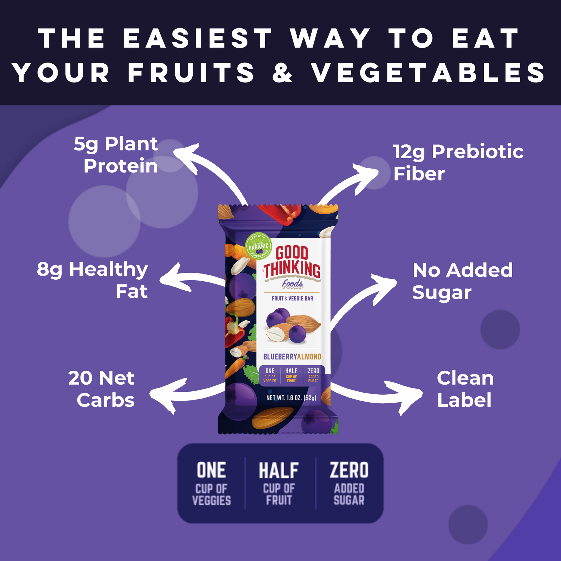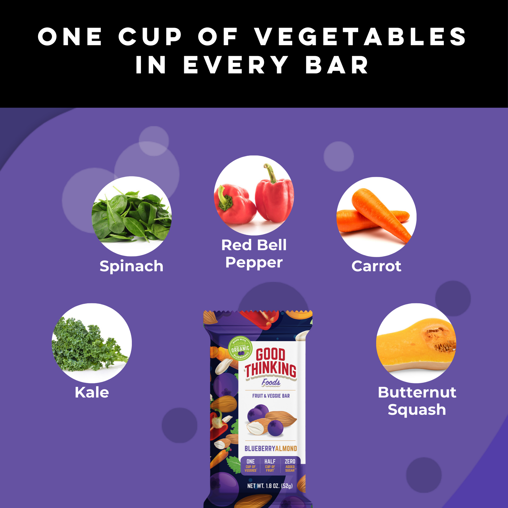 Made with 100% Real Fruits & Vegetables, No Added Sugar. No other bar on the market comes close to providing the brain and body boosting power of 1 cup of premium quality vegetables and a 1/4 to 1/2 cup premium quality real fruit with no added sugar. If you’re looking to eat a plant-based diet, it doesn’t get any more plant-based than a Good Thinking Bar.