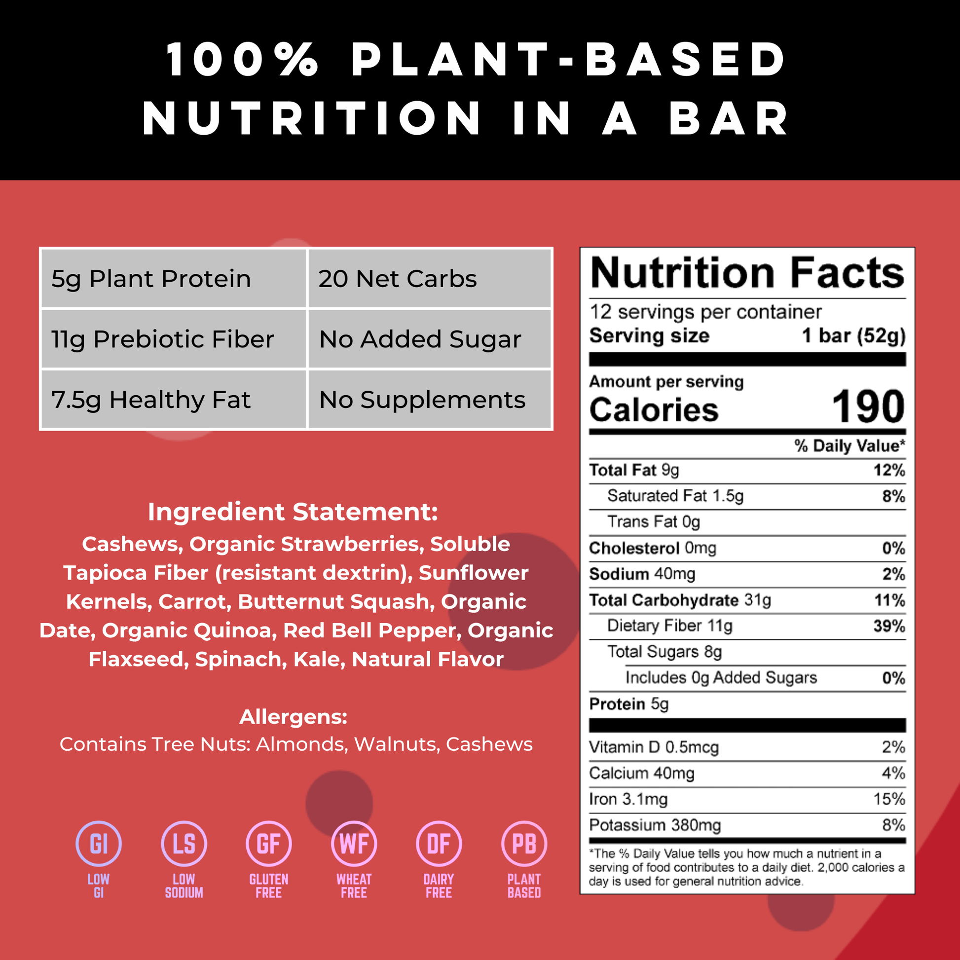 Ingredient Statement: Cashews, Soluble Tapioca Fiber, Organic Strawberries, Sunflower Kernels, Carrot, Organic Dates, Butternut Squash, Organic Quinoa, Red Bell Pepper, Organic Flaxseed, Spinach, Kale, Natural Flavor, Almonds. Allergens: Contains Cashews, Almonds, Walnuts.