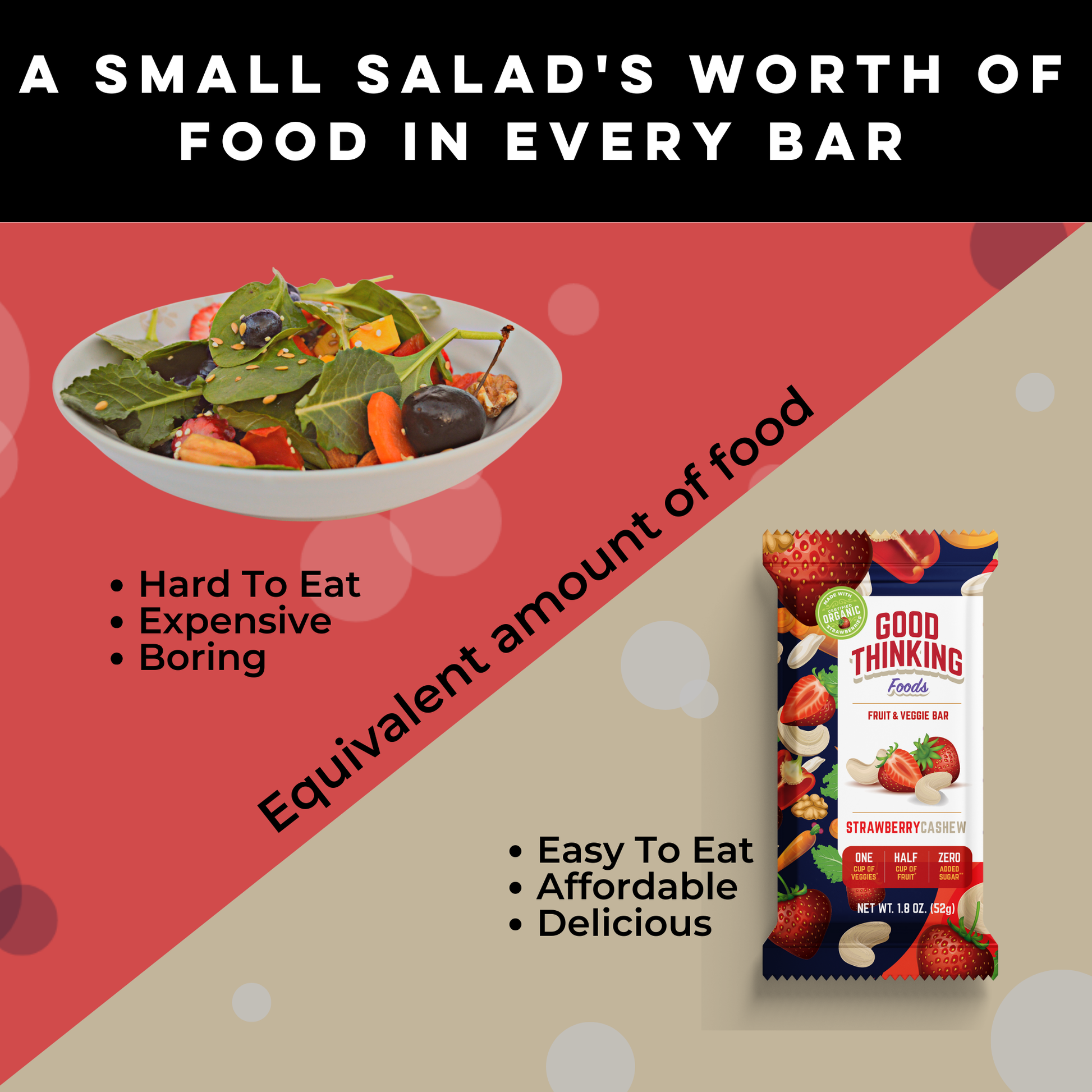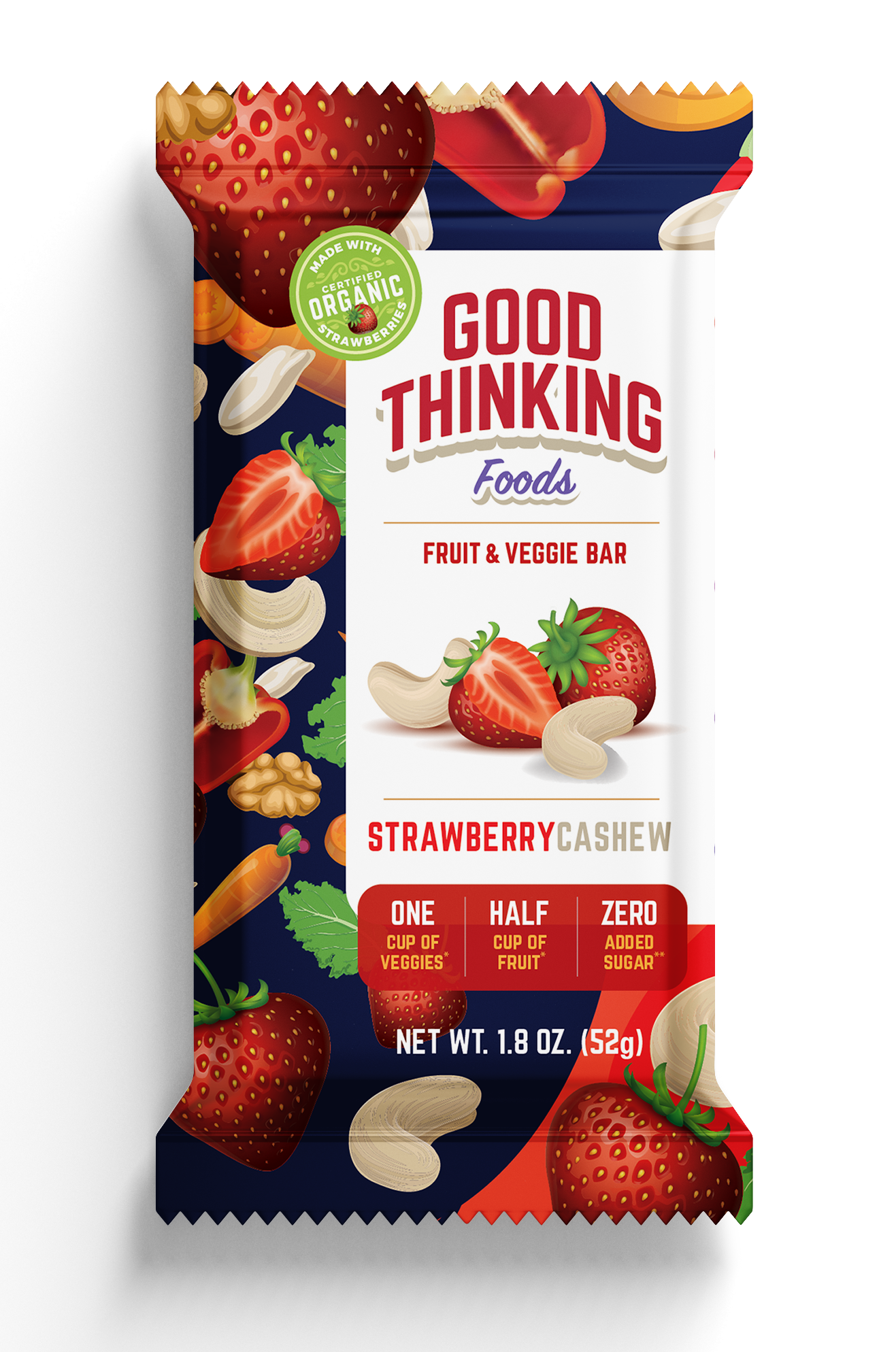 Made with 100% Real Fruits & Vegetables, No Added Sugar. No other bar on the market comes close to providing the brain and body boosting power of 1 cup of premium quality vegetables and a 1/4 to 1/2 cup premium quality real fruit with no added sugar. If you’re looking to eat a plant-based diet, it doesn’t get any more plant-based than a Good Thinking Bar.